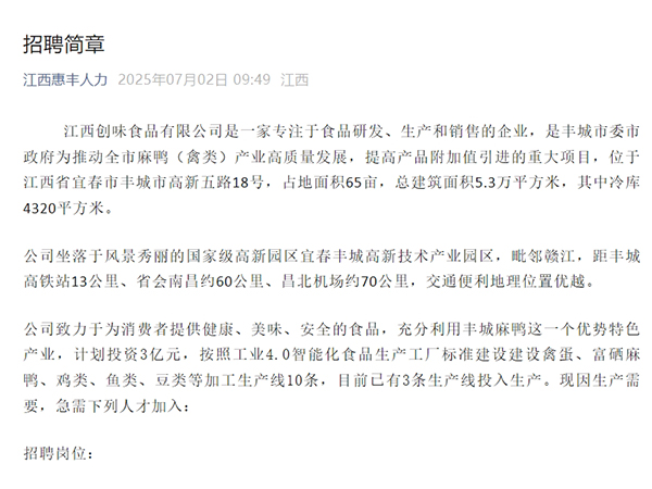 江西創(chuàng)味食品有限公司是一家專注于食品研發(fā)、生產(chǎn)和銷售的企業(yè),是豐城市委市政府為推動全市麻鴨(禽類)產(chǎn)業(yè)高質(zhì)量發(fā)展,提高產(chǎn)品附加值引進的重大項目,位于江西省宜春市豐城市高新五路18號,占地面積65畝,總建筑面積5.3萬平方米,其中冷庫4320平方米。公司坐落于風(fēng)...